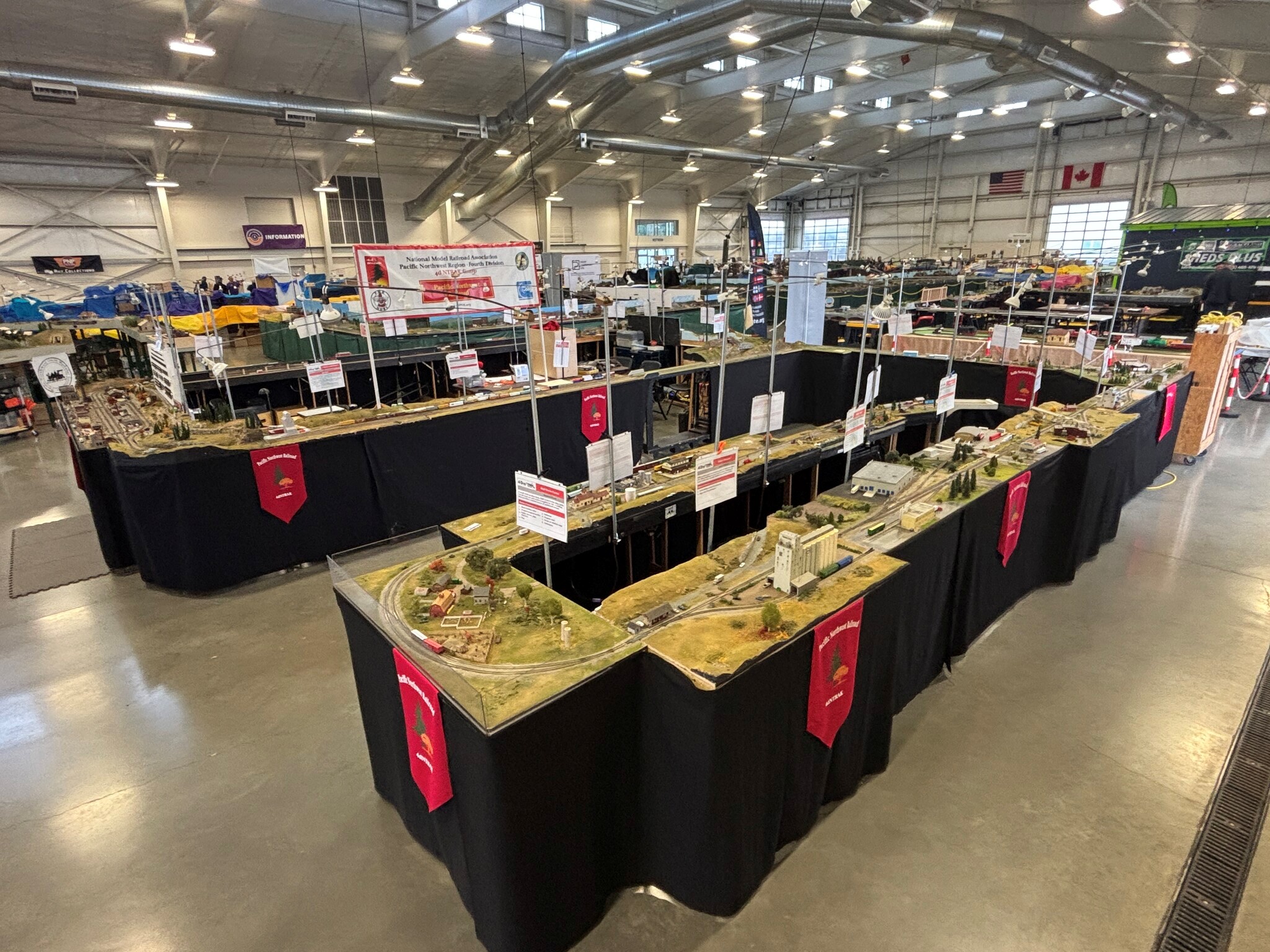 The 4th Division NTRAK Modular Group has been running trains since 2001. We have about twenty members and over sixty modules. The 4th Division supplied our four original corner modules; we added the spectacular yard shown below for PSX2004 and an even bigger and better yard in 2013. With four large classification yards, engine service facility, and several major manufacturers, we now have enough room to handle many prototype-length trains—many hundreds of cars!