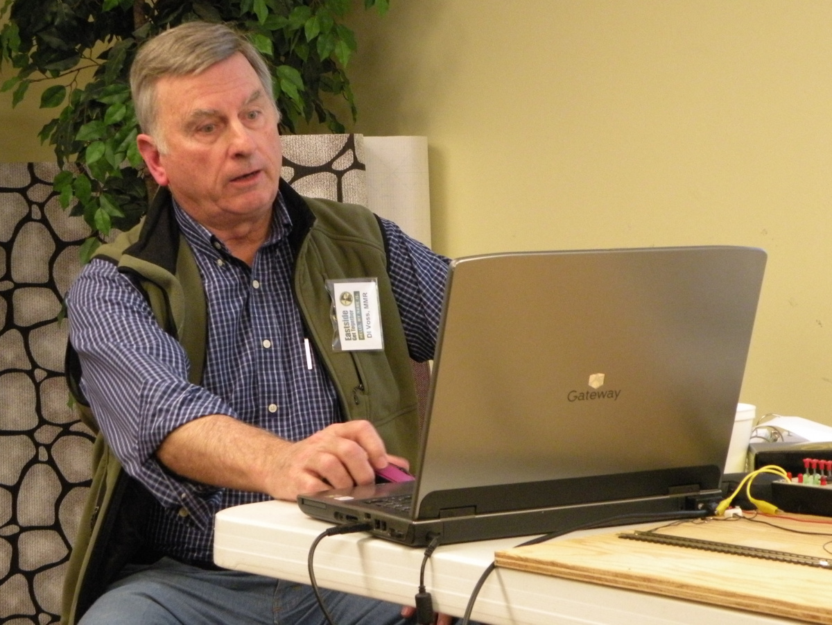 After the break, Di Voss was introduced as the speaker for the evening. Di’s theme was DCC, although he said it was meant to be more of a roundtable discussion on DCC rather than him just talking about it. After polling the audience, Di found he had a rather experienced crowd and so steered the discussion accordingly. He did run through the process of programming a decoder using JMRI’s Decoder Pro software. Being able to see what Di was doing projected on the wall was a big help to the discussion and many questions were answered. Di also mentioned that within a year (give or take), 8-pin connectors in decoders would be replaced with 21-pin connectors. This showed the evolution of decoders and that modelers were demanding more options with what they could actually do with their decoders. The highlight of Di’s presentation was a rotary snowplow that actually turned, thanks to a decoder. Di cautioned everyone on the growing practice of wiring a capacitor across the decoder to help trains across bad stretches of track. Although it’s okay on a small scale, too many capacitors may trick the power station into thinking there is a short somewhere and shut the whole system down. For the beginners in the room (there weren’t many), Di explained some of the common terms used with DCC. All in all, a very useful and well-received clinic. Thanks, Di.