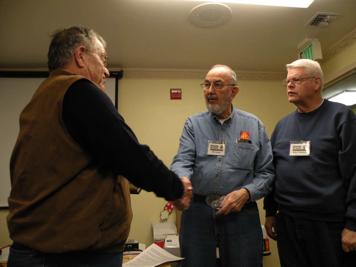 About 30 members were present at the Eastside Get-Together on Thursday, 11/17 when JJ Johnston opened the meeting at 7:30pm. JJ started in his usual fashion by introducing members of the 4D and PNR leadership as well as any MMR’s that were present. He then turned the floor over to 4D Superintendent Ken Liesse, who in turn gave way to Ed Liesse and Walt Huston for the presentation of the 2011 Golden Grab Iron Award. The Golden Grab Iron is the 4D’s annual “Member of the Year” award and is decided on by the winners of the award the previous three years. Only past winner Gay Liesse wasn’t present as she was recovering from back surgery only a few weeks before. Much to his surprise, this year’s winner was Eastside’s very own emcee, JJ Johnston. (See previous article on the award in the Grab Iron.)