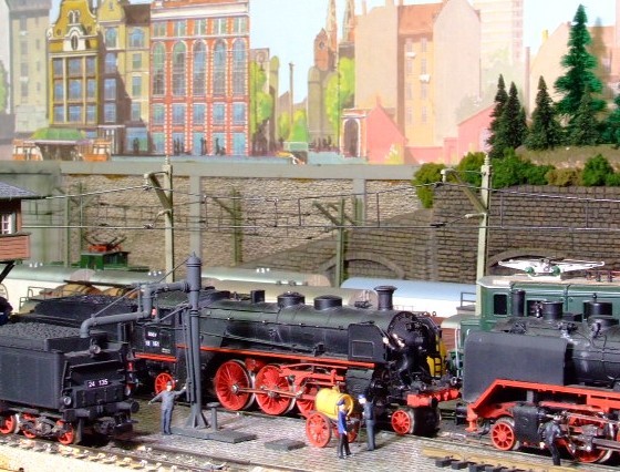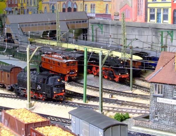 In the First photo an 03 Pacific and an E13 1-C-1 await their scheduled departure times at the Karlsberg “ Hauptbahnhof” while an 0-8-0T drills the coach yard.