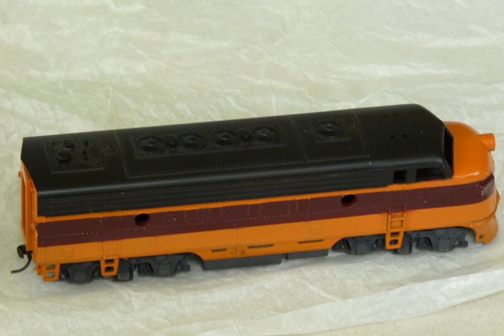 Chris F showed two more of his in-process HO projects. There was a box car with contrasting roof walk. Chris says he doesn’t know if this is prototypical, but he likes the look anyway. And there was a partially painted F7 which looked pretty good even missing the black stripe and lettering.