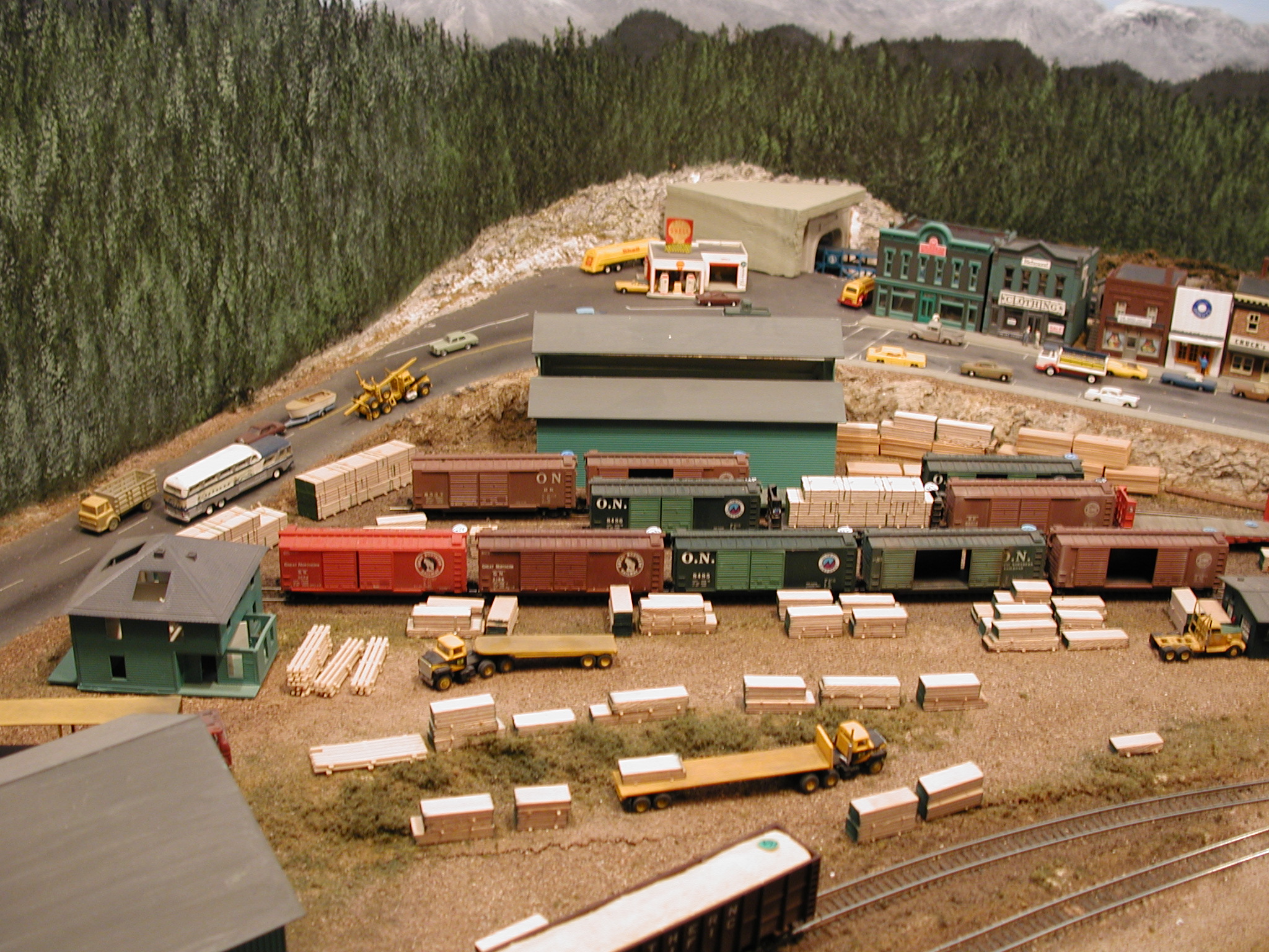 The N scale Olympic Northern Railroad runs from room-to-room throughout the basement as a point-to-point run. Tons of scenery and switching operations in each room, even the rest-room/laundry room. DC power.