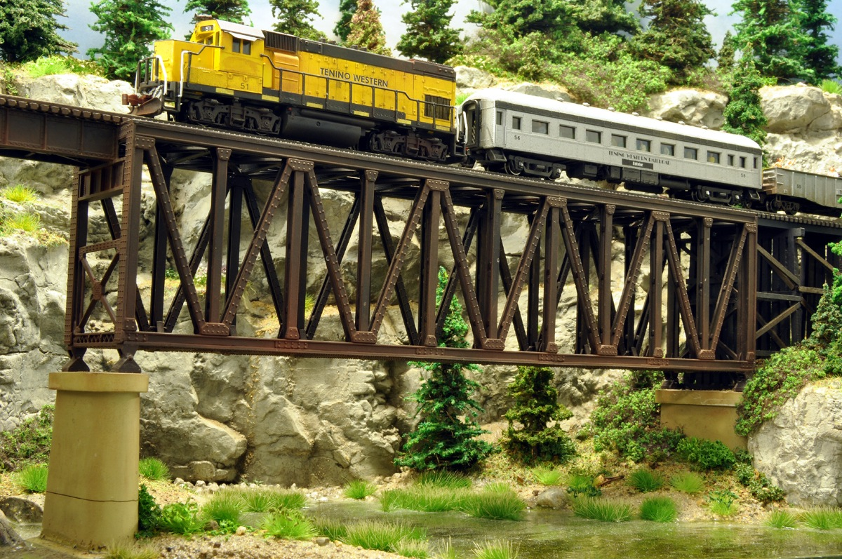 The N scale point-to-point Tenino Western Railroad fills half a basement with magnificent scenery and thousands of details. Diesel power pulls trains over bridges and trestles and through woods. Numerous industries require cars for fun operations. Includes a rail barge operation at Cosmopolis. DCC.