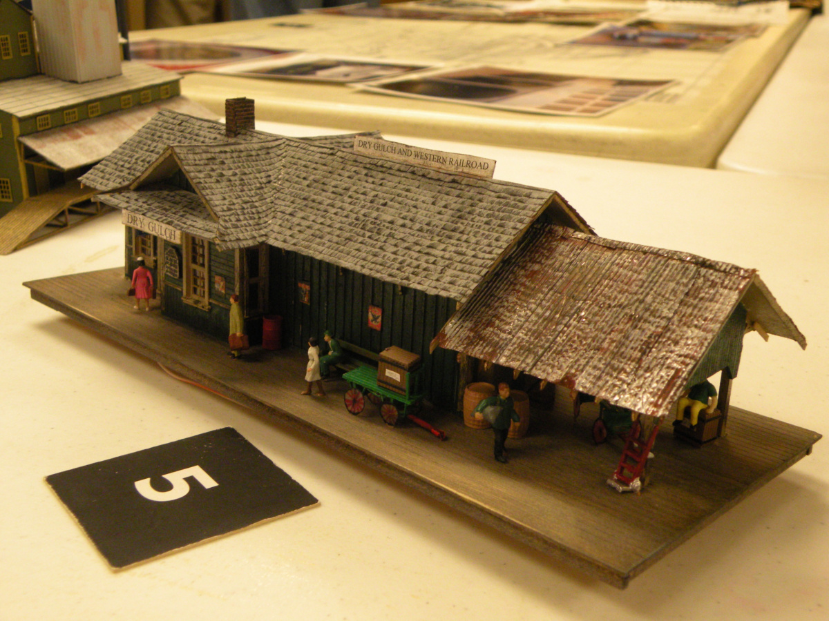 The Model of the Month contest had several very good and varied entries this month. Jim Sabol brought a couple of wall pieces for his O scale Tacoma Union Station that he was building with the help of Kyle Davis, a student at Washington State University. Bob Beise showed off a #6 double-slip switch that he built with Fast Track jigs — in only four hours. Ron Cole presented a 1:32 scale 70-ton 40′ flat car for which he had built all the masters. Ron plans on making several more cars from these masters. Stu Rogers displayed an N Scale Architect lumber mill, which requires that the builder supply his own instructions as the ones in the kit are inadequate. The winner of the contest was David Yadock, who brought in the combination station seen at left. The station is a Campbell kit with details and interior lighting added as well as a good dose of weathering. Nicely done, David.
